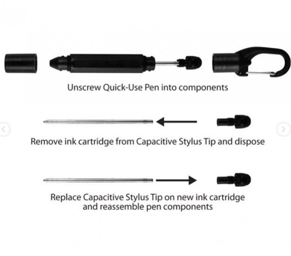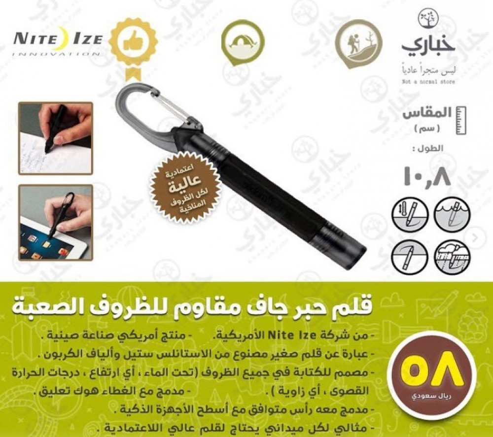 قلم حبر جاف صغير الحجم مقاوم للظروف الصعبة من شركة نايت آيز .. مصنوع من ألياف الكربون . . مدمج معه في طرفه الاخر رأس مثالي للتعامل مع أسطح الأجهزة الذكية . . غطاء القلم مزود بهوك لإتاحة لأغراض التعليق .