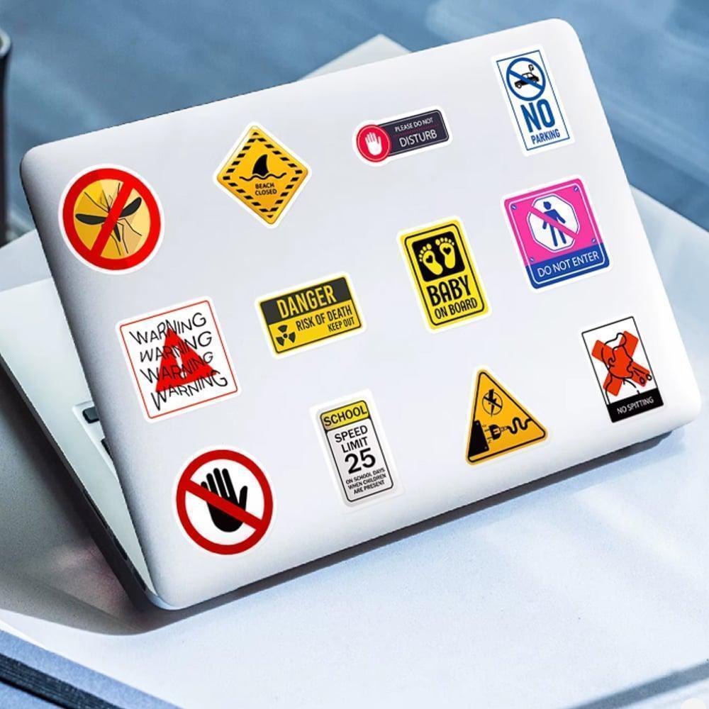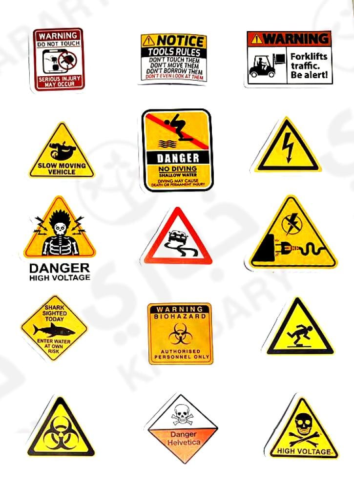 - ملصقات هذه المجموعة عبارة عن علامات تحذيرية متنوعة .
