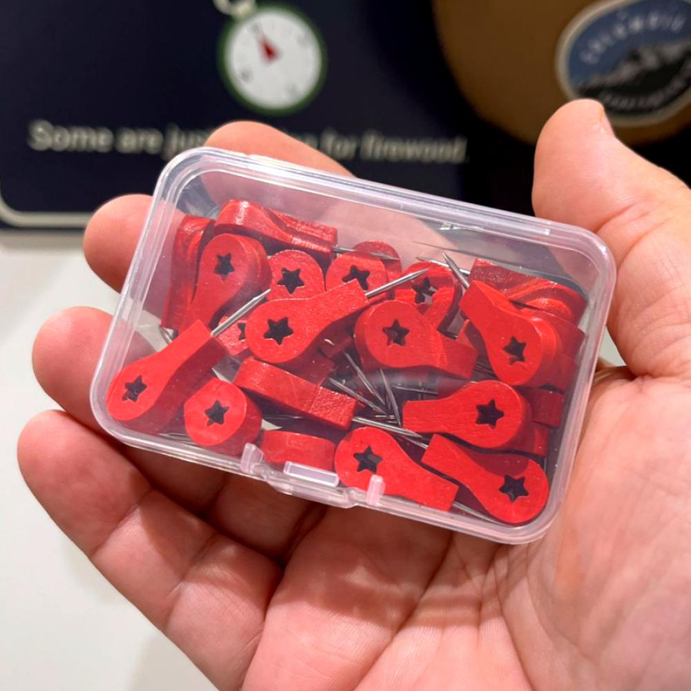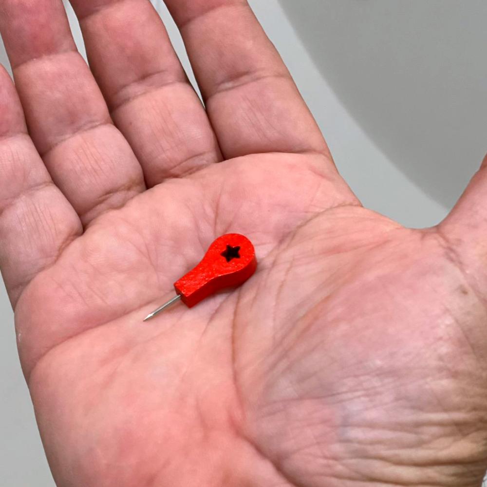 - عبارة عن دبابيس خريطة خشبية حمراء لتعليق الأوراق وتحديد المواقع على الخرائط ونحوها حال تثبيتها على ألواح الفلين .