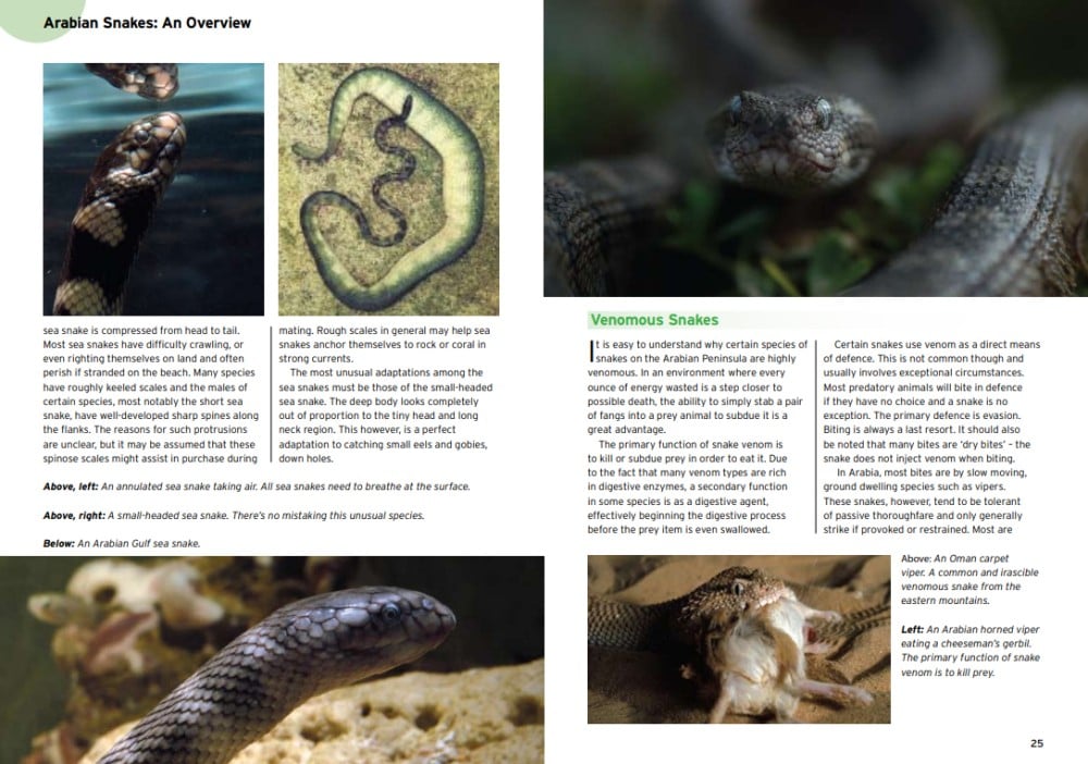 ويقدم وصفاً شاملا ومصوراً عن جميع فصائل أفاعي شبه الجزيرة العربية ومياهها والتي يبلغ عددها 55 فصيلة .